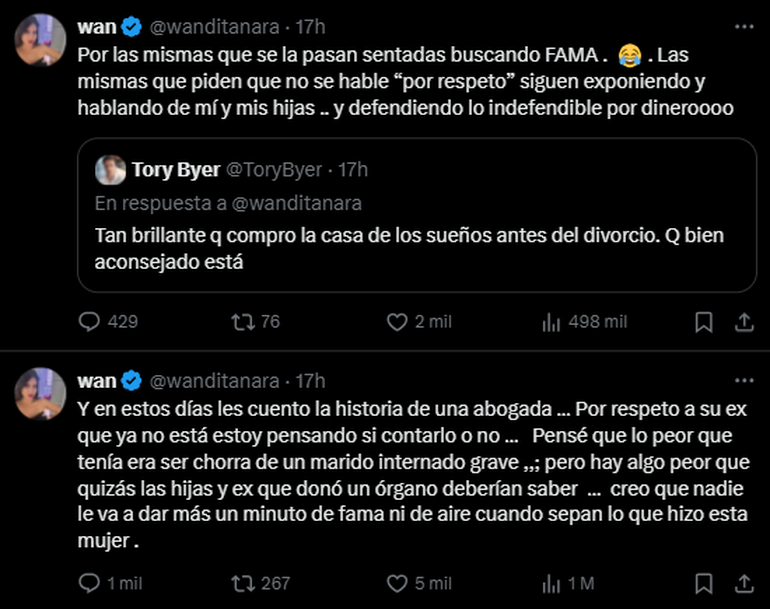 Así, continuo la serie de tuits, como consecuencia a la aparición de las defensoras legales de Icardi en diversos paneles de TV durante el día viernes. Ese mismo día, por la tarde en el ciclo de Viviana Canosa, se había referido a la cuota alimentaria. “No son necesidades alimentarias. Dos nenas no necesitan 50 mil dólares por mes”, lanzó la letrada. “Entre las cosas que Wanda Nara pide es avión privado de forma discrecional y no se puede tener los beneficios de la casada con los goces de la soltera. No se puede. Si vos decidiste separarte, el avión privado se terminó”, arrojó, punzante para asegurar que la animadora “empezó pidiendo 300 mil”.