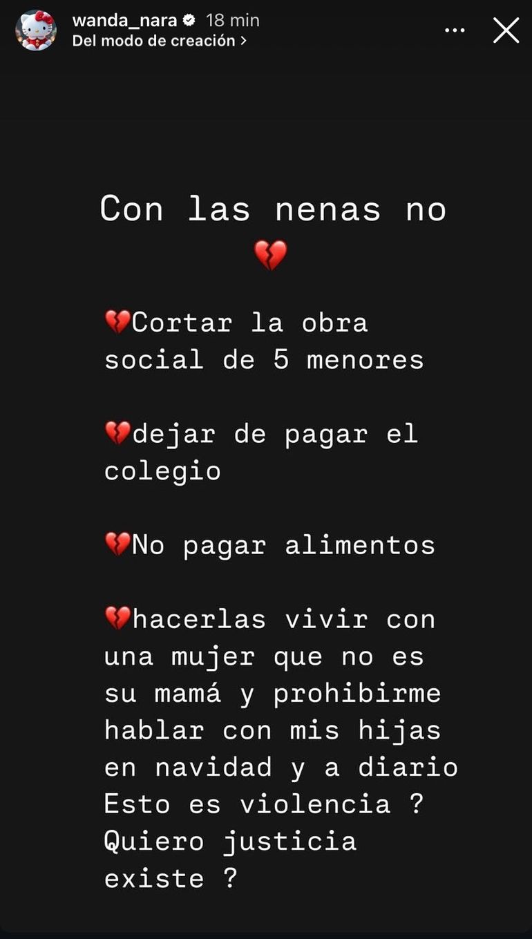 En una historia de Instagram dejó más que claro que entre ella y él está todo muy mal. Bajo el título “Con las nenas no” acompañado de un corazón roto, la empresaria enumeró las cosas que Icardi incumple con sus dos hijas Francesca e Isabella. Claro que un detalle no pasó inadvertido y confirma, al mismo tiempo, el romance de Icardi con la China Suárez.