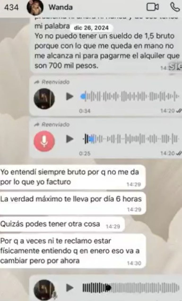 En la negociación Wanda le ofertó: “Yo más de esto, en estos momentos, no puedo pagarte. De 16 a 21 o de 15 a 20 puedo pagarte un millón y tenés la mañana libre. Avisame”. Ante esto Luli respondió: “Sí, por eso, pero entonces voy a tener que cumplir eso a partir de las 15 o 16, porque responder mensajes o hacer cosas con el celu desde las 8 de la mañana también es trabajar. Pero ahora no me puedo dormir, tengo que buscar otro laburo. Yo con un millón solo pago el alquiler, que encima ahora, el mes que viene, me lo ajustan”.