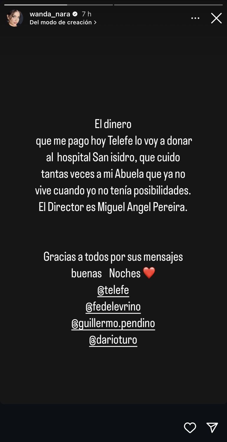 El centro de salud, bajo la dirección de Miguel Ángel Pereira, según detalló la empresaria, fue el refugio en tiempos complicados para la familia enfrentaba limitaciones económicas. Por ello, Wanda, en memoria de su abuela, tomó esa decisión como una muestra de gratitud. “Gracias a todos por sus mensajes. Buenas noches”, cerró el comunicado. En cuanto a la suma de dinero que cobró se desconoce el monto.