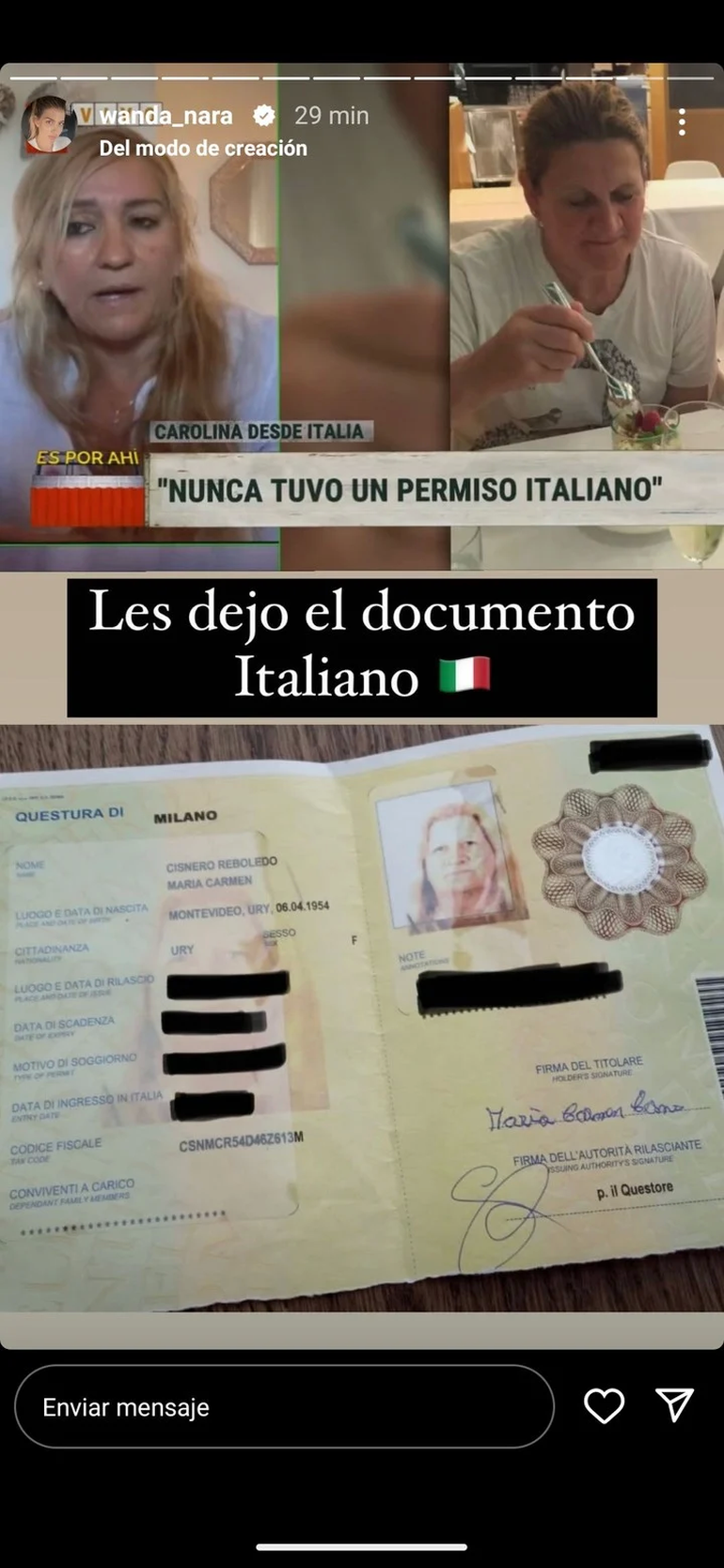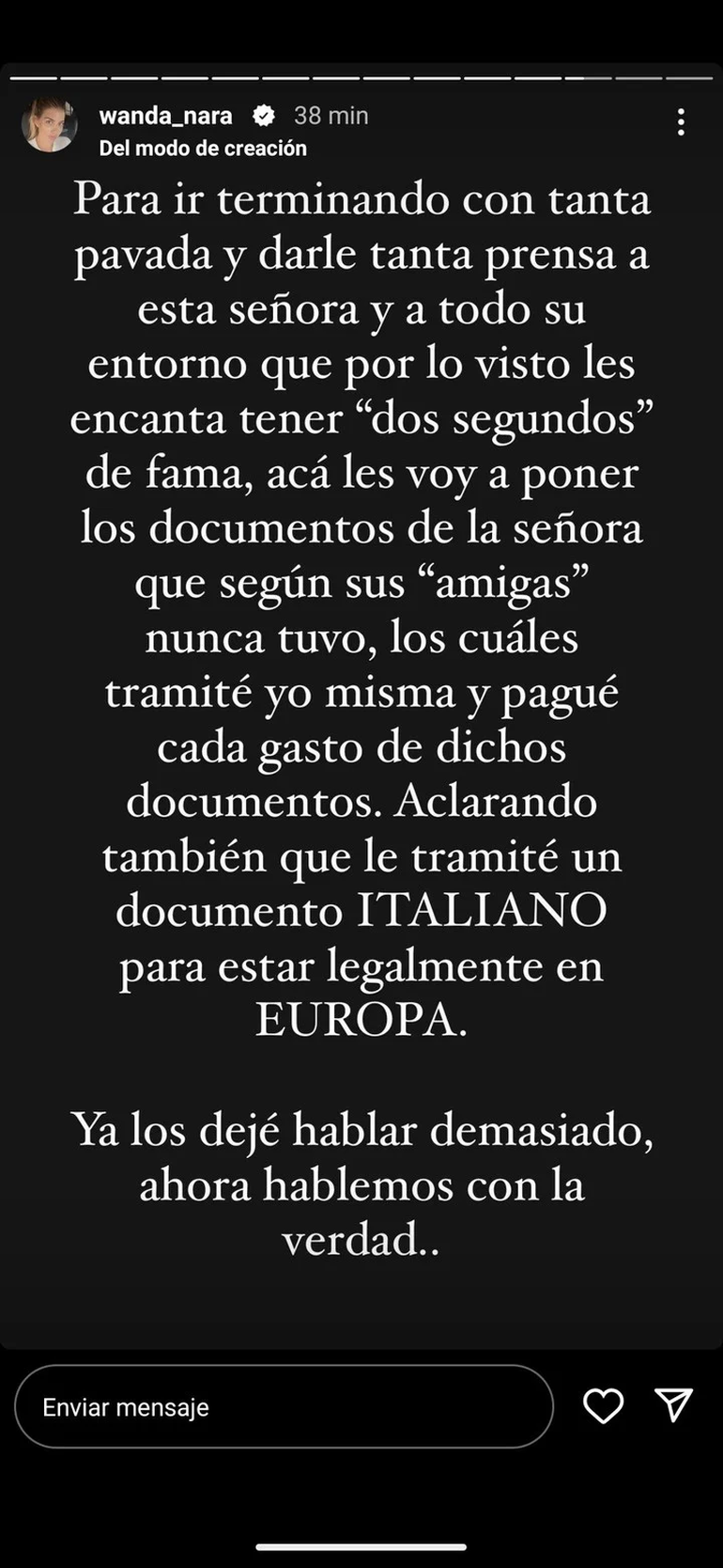 No quedó ahí y desde sus historias de Instagram, seguían disparando desde la cuenta de Wanda Nara: "Aclarando también que le tramité documento italiano para estar legalmente en Europa. Ya los dejé hablar demasiado, ahora hablemos con la verdad...".