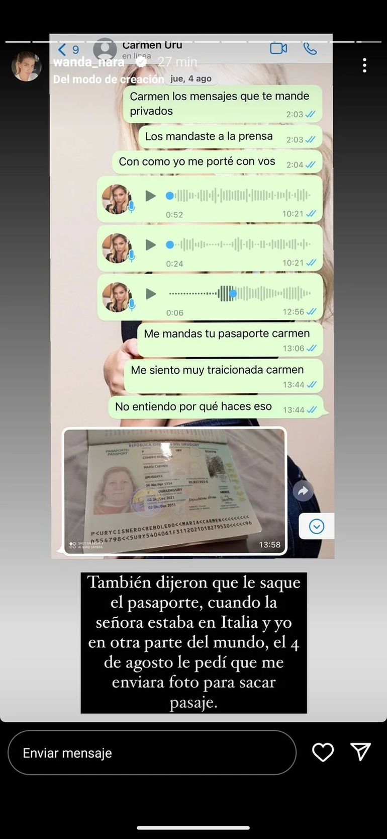 "También dijeron que le saqué el pasaporte, cuando la señora estaba en Italia y yo en otra parte del mundo, el 4 de agosto le pedí que me enviara foto para sacar el pasaje", contó mientras en la imagen se ve la captura del chat.