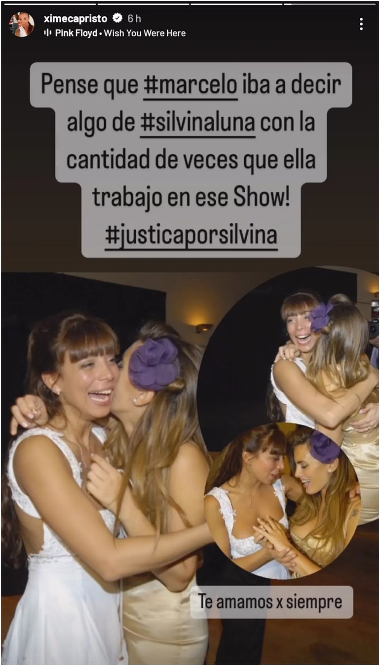 En su cuenta de Instagram, Capristo compartió su desilusión y escribió: "Pensé que Marcelo iba a decir algo de Silvina Luna. Con la cantidad de veces que ella trabajó en ese show. #JusticiaPorSilvina. Te amamos por siempre". La panelista no dudó en defender la memoria de su amiga y cuestionar la decisión de la producción del Bailando 2023.