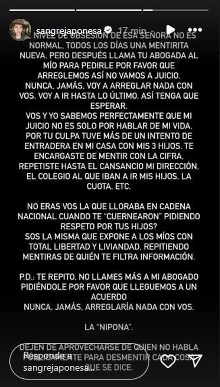 La China expresó: “El nivel de obsesión de esa señora no es normal, todos los días una mentirita nueva, pero después llama tu abogada al mío para pedirle por favor que arreglemos, así no vamos a juicio. Nunca, jamás, voy a arreglar nada con vos. Voy a ir hasta lo último, así tenga que esperar”.