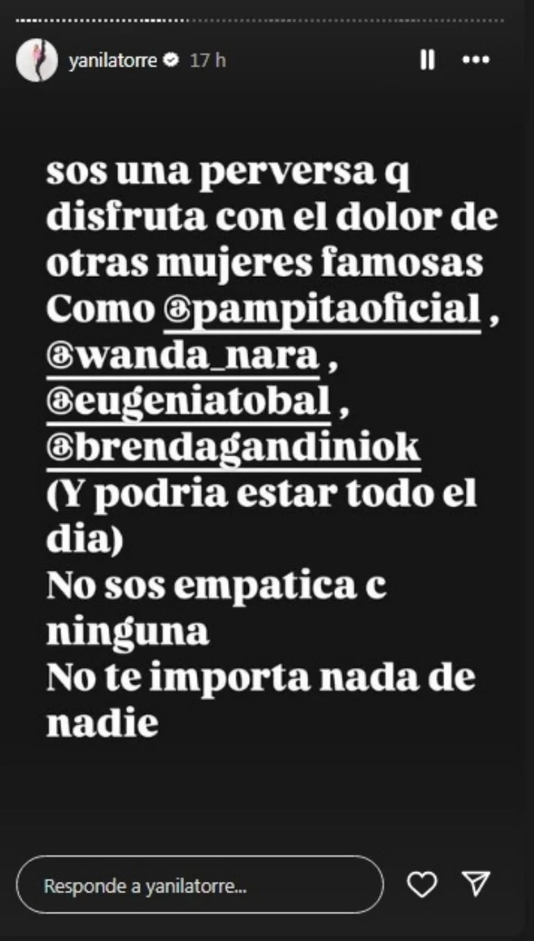 Luego, la periodista confirmó que sí habría pasado algo entre Heredia y Suárez durante el rodaje de ATAV. "Sos una perversa que disfruta con el dolor de otras mujeres famosas, como Pampita, Wanda Nara, Eugenia Tobal y Brenda Gandini (y podría estar todo el día). No sos empática con ninguna. No te importa nada de nadie".