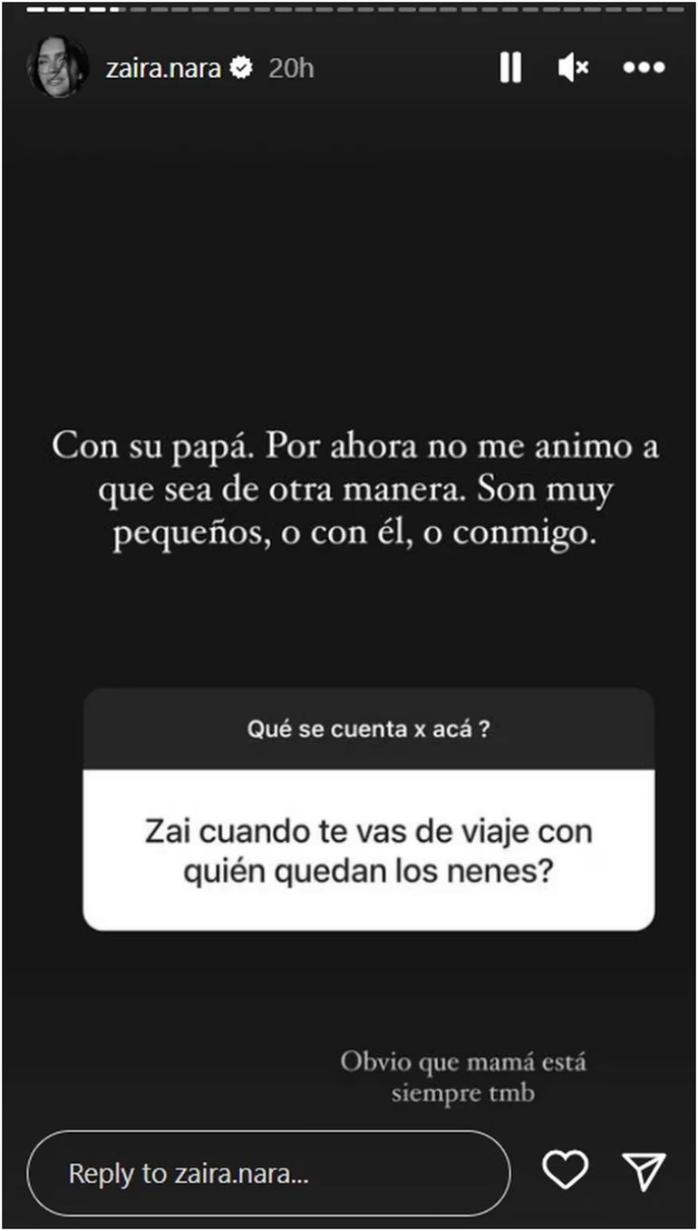 Es que en Instagram un seguidor le consultó algo relacionado a sus hijos que abrió las puertas para que Zaira Nara vuelva a mencionar a Jacob Von Plessen. “¿Cuando viajas a quién le dejas los nenes?”, fue la pregunta de su seguidor.