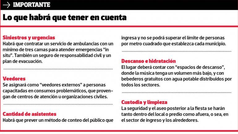 Otros requisitos que se sugieren son los espacios internos para descansar del ruido, afiches que adviertan sobre consumos problemáticos y la presencia de “veedores” especializados en alcohol y drogas entre el público.