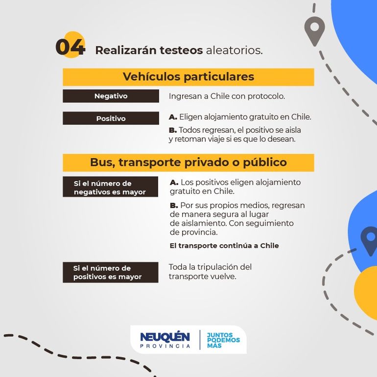 En cambio, para quienes viajen con destino al vecino país, en la frontera trasandina se le solicitará una declaración jurada, llama C19 y si es extranjero un seguro COVID.También, todos los viajantes deben estar dispuesto a someterse a un test de antígenos, ya que aleatoriamente será realizado al 10 por ciento de las personas antes de que ingresen al territorio nacional.