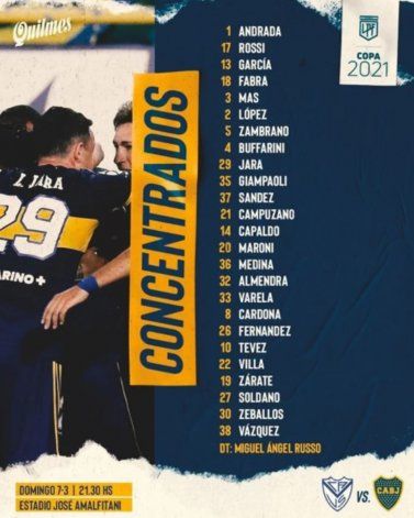 Luego que fuese convocada la lista de los 25 concentrados de Boca, este sería el 11 del Xeneize contra Vélez este domingo: Esteban Andrada, Nicolás Capaldo, Lisandro López, Carlos Zambrano, Frank Fabra; Cristian Medina, Jorman Campuzano, Edwin Cardona; Sebastián Villa, Carlos Tevez y Mauro Zárate.