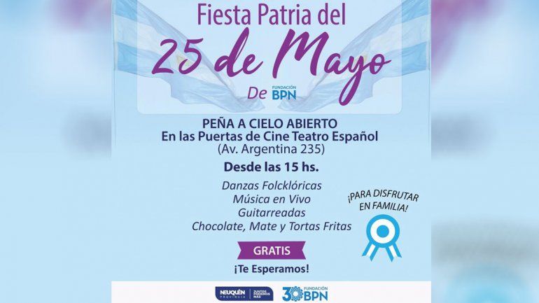 EN tanto, la Fundación BPN realizará diversas actividades culturales. Desde las 15 afuera del Cine Teatro Español se llevará adelante una "peña a cielo abierto" con danzas folklóricas, guitarreada, música en vivo. Los vecinos también podrán disfrutar de unos infaltables mates, tortafritas y chocolate.