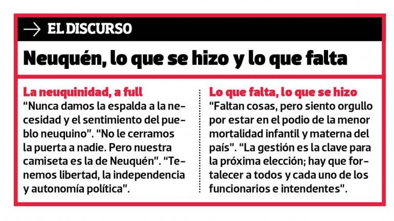 En algún punto, definió cómo juega el MPN en el contexto nacional de hoy, signado por la zozobra económica. “Nosotros no nos metemos en el andarivel nacional. El país cada ocho años gira a la izquierda o a la derecha. Nosotros vamos por el centro. Nuestra camiseta siempre fue y será la de la provincia”, aseguró. “El enemigo está afuera, acá adentro respetémonos”, planteó en un párrafo quizás reservado a sus pares del partido que buscan disputarle el control del MPN y el gobierno provincial.