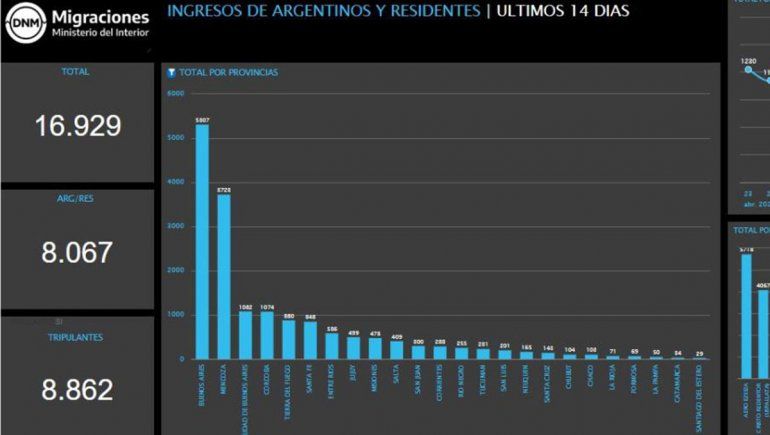 En el caso de los ingresos, las autoridades provinciales pueden visualizar la cantidad, la fecha y el país de procedencia -y países de tránsito de los últimos 14 días- de argentinos nativos y residentes.
