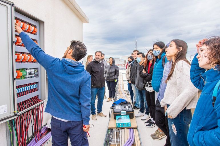 Estudiantes de la Facultad de Ingeniería de la UNCo recorrieron este martes por la mañana la terraza de la Legislatura donde se encuentran instalados los 204 paneles solares que desde la semana pasada producen el 10% de la energía consumida en el edificio, permitiendo ahorrar unos 3 millones de pesos anuales.