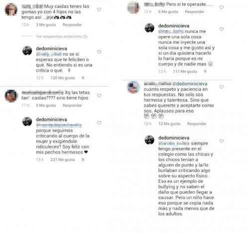 Algunas de las seguidoras fueron contundentes. “Las tetas te están por llegar al ombligo, nena. ¿Qué pasó ahí?”, escribió una. Y otra comentó: “Tenés muy caídas las gomas, yo con 4 hijos no las tengo así. Ja, ja”.