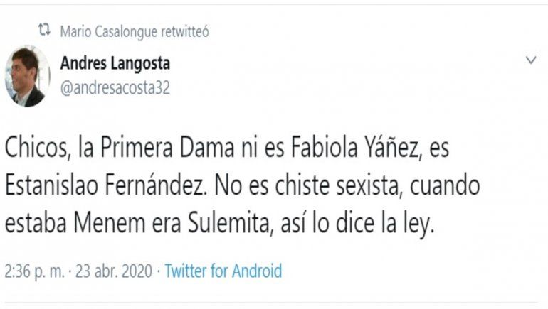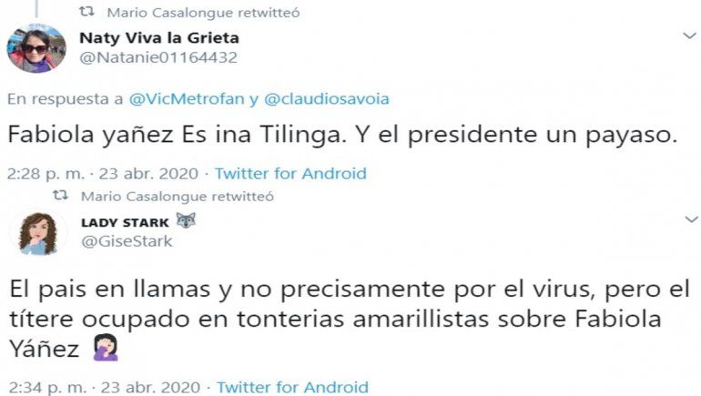 Minutos después que los medios se hicieran eco de la denuncia de Yañez, Casalongue replicó una serie mensajes contra Yañez y Alberto Fernández: "Fabiola Yañez Es una Tilinga. Y el presidente un payaso"; "Chicos, la Primera Dama ni es Fabiola Yáñez, es Estanislao Fernández. No es chiste sexista, cuando estaba Menem era Sulemita, así lo dice la ley", "El pais en llamas y no precisamente por el virus, pero el títere ocupado en tonterias amarillistas sobre Fabiola Yáñez".
