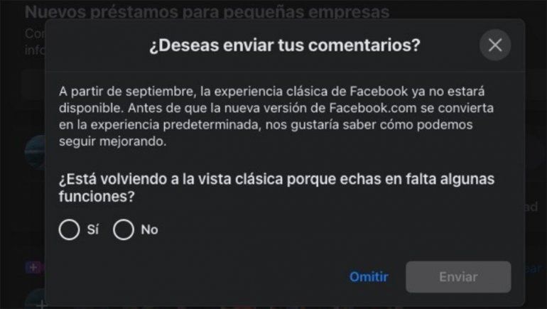 "A partir de septiembre, la experiencia clásica de Facebook ya no estará disponible. Antes de que la nueva versión de Facebook.com se convierta en la experiencia predeterminada, nos gustaría saber cómo podemos seguir mejorando."
