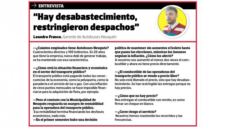 Los directivos de Autobuses Neuquén están trenzados en una pelea por la cantidad de combustible que les venden y el precio al que se lo entregan. Lo que ha estado sucediendo en las últimas semanas es que “hay un marcado desabastecimiento”, resumió ante la consulta de este diario el gerente de la prestadora de la ciudad, Leandro Franco.