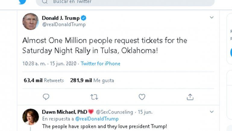 Ese hecho había generado gran expectativa para Trump quien tuiteó: "¡Casi un millón de personas solicitan entradas para el Rally de la noche del sábado en Tulsa, Oklahoma!".