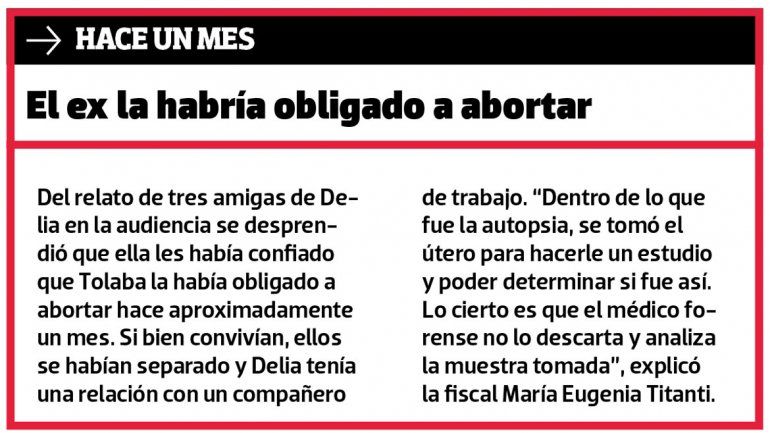 En la audiencia realizada ayer, Titanti expuso múltiples elementos que apuntan al principal y único sospechoso por el crimen: el gendarme Diego Tolaba, con quien la víctima convivía en una casa en calle Soldado Desconocido. Tolaba fue acusado por homicidio doblemente agravado por el vínculo y por femicidio, delito que prevé una pena de prisión perpetua.