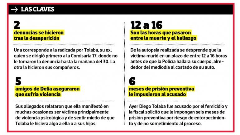 Un día después de que la Policía encontrara asesinada a Delia Aguado (32) en el balneario Sandra Canale, la fiscalía acusó por el femicidio a su ex pareja y padre de sus hijos, Diego Tolaba (33), quien quedó con prisión preventiva por seis meses. En apenas 24 horas de investigación se pudo determinar de que la víctima sufría violencia de género.
