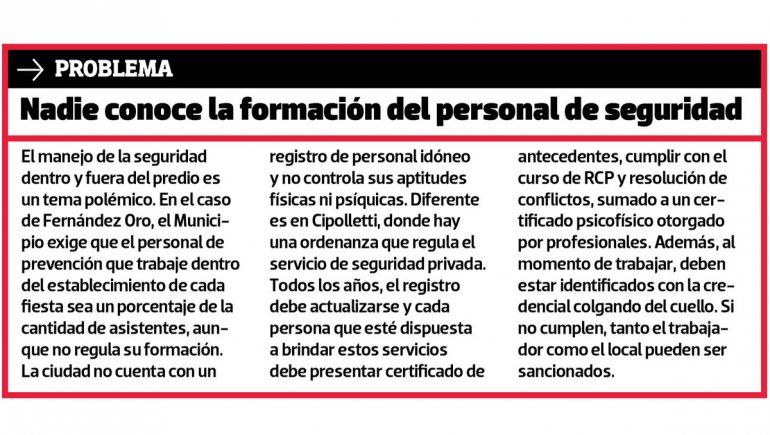 Desde la Muni contaron que en una fiesta con capacidad para 2500 asistentes se prevé un grupo de 13 personas encargadas de la seguridad privada del evento, pagado por la propia organización. A eso se le suman una docena de empleados municipales del área de Tránsito, Cultura y Comercio, y efectivos policiales dispuestos por la comisaría. Los costos del personal municipal son cubiertos con fondos de la comuna, con el dinero recaudado del cobro del 8% de la venta total de entradas.