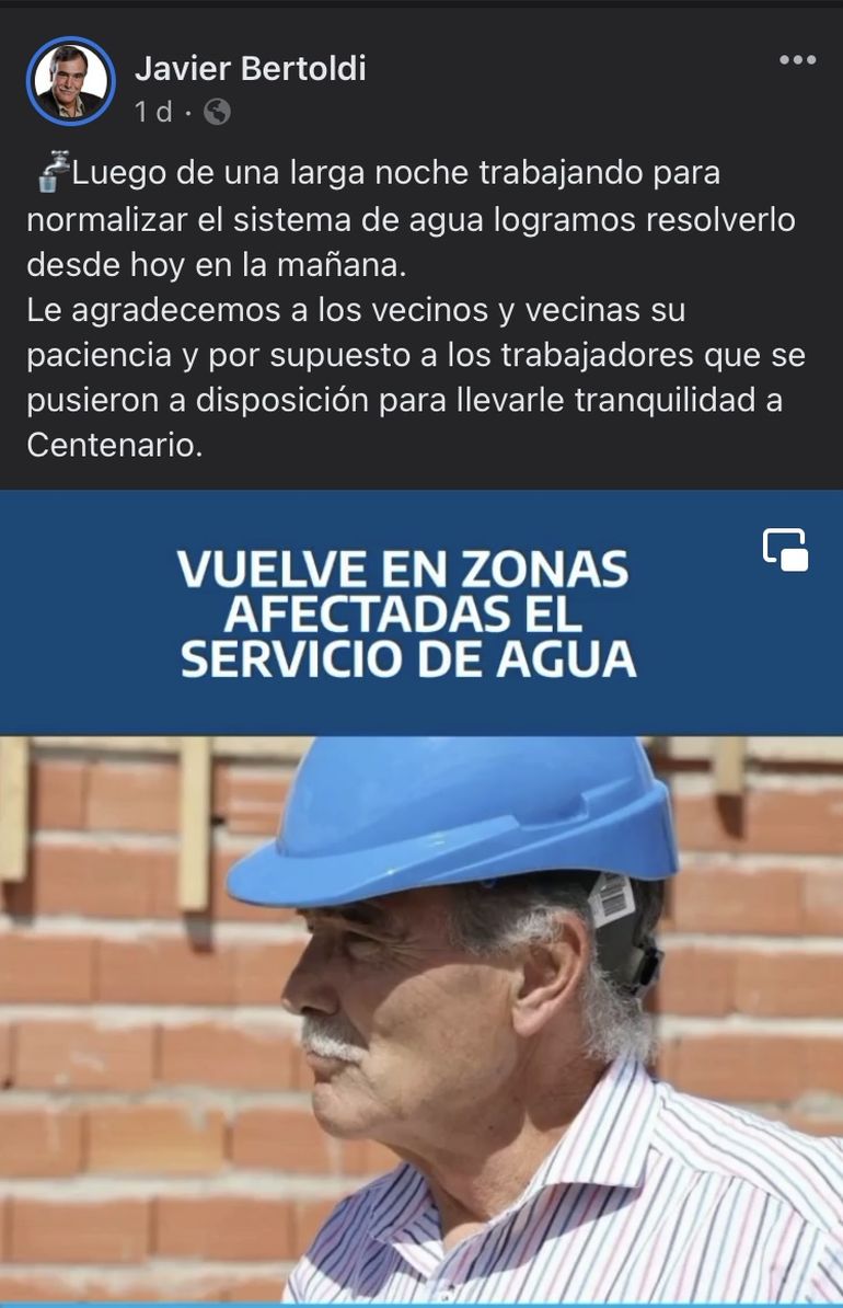 "Luego de una larga noche trabajando para normalizar el sistema de agua logramos resolverlo desde hoy en la mañana. Le agradecemos a los vecinos y vecinas su paciencia y por supuesto a los trabajadores que se pusieron a disposición para llevarle tranquilidad a Centenario”, explicó el jefe comunal.