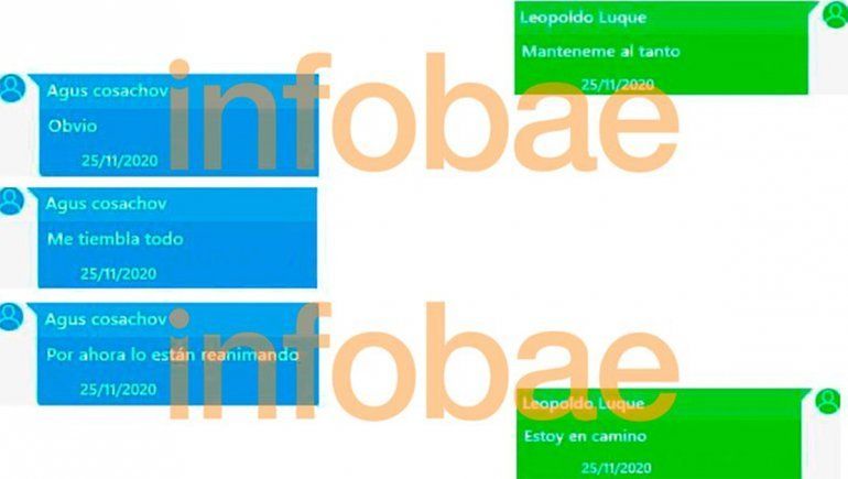 Luego de eso Luque le envía dos audios seguidos en los que le consulta sobre si cuando ellos lo intentaron reanimar a Diego. Cosachov responde por escrito que se lo palpó y que “parecía muerto”. El neurocirujano intenta calmar a su compañera de equipo médico: “Tranqui. Tratá de bajar. Esto es así, es así. Es un paciente complejo y bueno, va a pasar lo que tenga que pasar. Nosotros vamos a estar ahí a bancar la que venga”, afirmó.