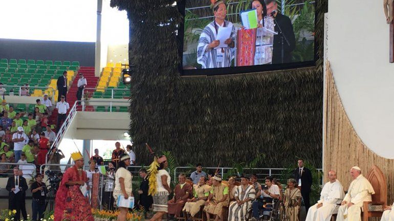"Francisco querido, la selva está contigo", le cantaban los pobladores en el breve recorrido que hizo en papamóvil por el predio adornado con juncos y flores del lugar y en el que el Papa habló desde un altar que tenía la silla labrada en madera.