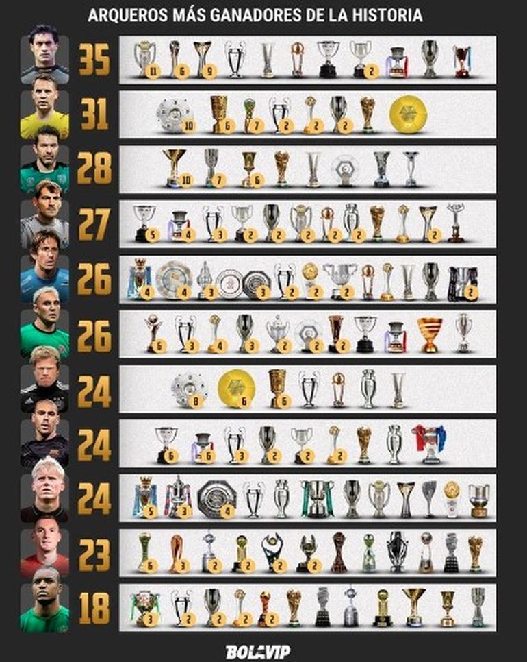 Otros de los arqueros más ganadores son Iker Casillas, Edwin Van der Sar, Keylor Navas, Oliver Kahn, Julio César y Peter Schmeichel.