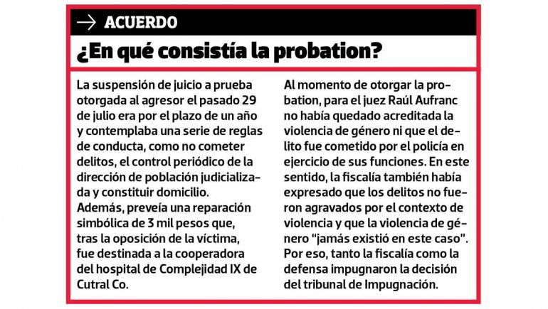 La querella impugnó la probation al considerarla “arbitraria”. El 9 de septiembre, un tribunal de Impugnación la revocó al tener en cuenta el contexto de violencia de género, aunque manifestó que “no queda claro que haya cometido el delito en ocasión de sus funciones”. La fiscalía y la defensa apelaron el fallo y ahora el TSJ deberá intervenir.