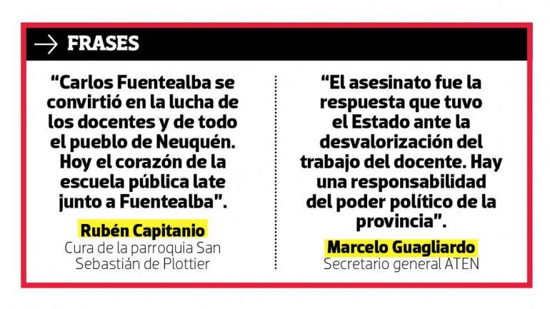 “Carlos Fuentealba se convirtió en la lucha de los docentes y de todo el pueblo de Neuquén. Hoy el corazón de la escuela pública late junto a Fuentealba”, dijo Rubén Capitanio, cura de la parroquia San Sebastián de Plottier.