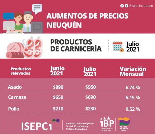 Señaló que, dentro de las carnicerías, el incremento más fuerte de julio fue "con el kilo de pollo entero, que pasó de 210 a 230, un 9,52 por ciento, pero vimos una suba importante con todos los productos". La carnaza, uno de los cortes vacunos más económicos, trepó de 650 a 690 pesos en un mes, un 6,15 por ciento más. Y el asado, infaltable en los domingos futboleros, se fue de 890 a 950 pesos, con un aumento del 6,74 por ciento.