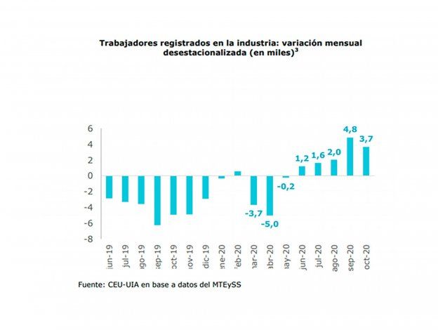 Además, la UIA envió una carta al presidente Alberto Fernández en la que señala que si bien el empleo formal en la industria creció en octubre pasado por quinto mes consecutivo y registra 4.500 empleos más que en la etapa de pre pandemia, desde 2013 a la fecha el empleo fabril se contrajo en 178.000 empleos y en el conjunto de la economía en 321.000 puestos de trabajo y que “el incremento de la informalidad ha esmerilado la competitividad de la economía registrada, aumentó la competencia desleal e imposibilitó consolidar la generación de empleo decente”.