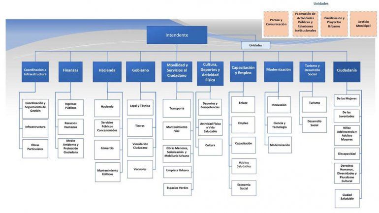 A partir del martes que viene, el municipio contará con diez secretarías y cuatro unidades de gestión. La futura estructura no modificará el gasto en sueldos. Si bien se sumarán secretarías, disminuirá la cantidad de áreas en rangos menores que funcionan en la actualidad.