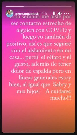 “Esta semana me aislé por ser contacto estrecho de alguien con Covid y luego, yo también di positivo, así es que seguiré con aislamiento en mi casa”, contó Paoloski en una historia de su cuenta de Instagram. Y continuó: “Perdí el olfato y el gusto, además de tener dolor de espalda, pero en líneas generales estoy bien, al igual que Sabry y mis hijos. A cuidarse mucho”, finalizó.