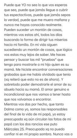 “Sostengan su información con pruebas que avalen lo que dicen. Muy pocas personas saben lo que paso realmente el 25 de noviembre, o lo que venía pasando hace años. A su vez te agradezco porque tu ataque constante me hace pensar miles de veces en las ganas que tengo de vivir. (…) Si bien creo que tu violencia verbal ya es suficiente y que deberían ponerte en horario de protección al menor, sigo agradeciéndote. Gracias Luis, gracias por hacerme ver quien soy. No te conozco, no me conoces, y tu realidad está muy lejos de ser la mía. Todo lo que decís de mí, en realidad te está definiendo a vos. Nunca vas a entenderme, así que, para evitarte un infarto, deja de intentarlo”