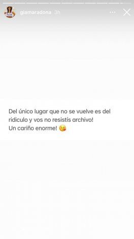 En otra parte de su extensa misiva, Gianina siguió tirándole dardos a Ventura, “Yo sola se lo que viví con él y podría mostrarte y así también mostrarle al mundo el pedazo de padre que tuve y cuál fue mi rol en su vida, pero me pasan dos cosas: 1- ¿Quién carajo sos vos para que yo te demuestre que lo que decís no es así? 2- Jamás lo expondría ante los ojos del mundo porque guardo en mí todo lo vivido y agradezco mis años de terapia para acomodar tanto. Gracias porque las mentiras que decís no las podes sostener, entonces gritas y amenazas, aún dejando más en evidencia mi teoría. Me pregunto ¿Qué pasaría si a mí realmente me afectara psíquicamente todo lo que están diciendo de mi familia? Si realmente esos dedos acusadores me derrumbaran, si las injurias hacia mi persona me afectarían ya que soy una caca de ser humano culpable hasta de si hace frío/calor para los comunicadores de la TV. ¿Qué tendría que hacer? ¿Caigo en un pozo depresivo? ¿Me empastillo? ¿Agarro alguna adicción? ¿Me suicido? Todas serían posibles si me afectaría de verdad que 24/7 estén hablando de la muerte de mi papá, sí, porque es Maradona pero también es mi papá, un abuelo, un hermano, un tío, un ser humano”, agregó la joven, que le aseguró al periodista que “del único lugar que no se vuelve es del ridículo y vos no resistís archivo”, y se despidió de ventura él con “un cariño enorme”.