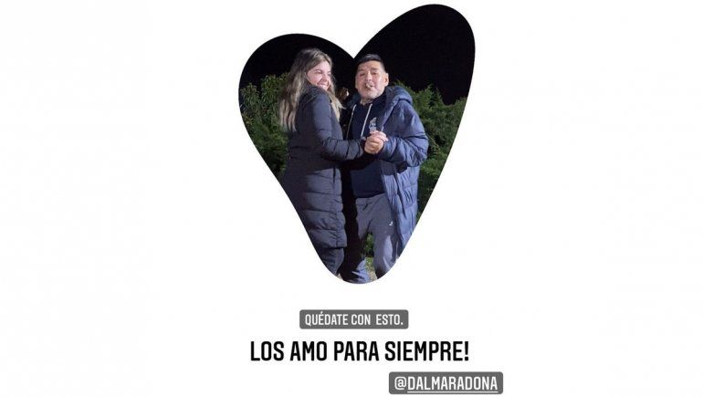 “Los amo para siempre”, escribió la diseñadora en una de sus historias de Instagram, junto a una imagen en la que se observaba a Diego bailando con Dalma. En la postal se lo ve con ropa deportiva y un habano en la boca, mientras que a ella se muestra con una larga campera y con una sonrisa enorme. “Quedate con esto”, agregó Gianinna, arrobando a su hermana.
