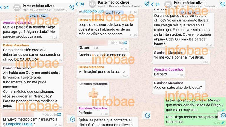 En la captura, fechada el 23 de noviembre, se puede ver un mensaje en el grupo preguntando por la salud de Maradona y si Gianinna podía ir a verlo a la casa que había alquilado en Tigre. “Hola, ¿cómo están? Por acá yo molestando nuevamente… ¿Alguien tiene novedades de papá? ¿Las visitan siguen sin poder ser a nuestras ganas de estar con él sino respetando su espacio?”.