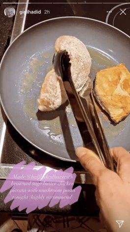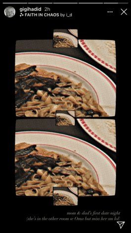 Gigi Hadid mostró a través de los Stories de su Instagram una cena en casa preparada por ella misma. Hizo una piccata de pollo con salvia y manteca con pasta de champiñones. "La primera noche de cita de mamá y papá", escribió Gigi Hadid junto a la foto del plato. La nena estaba en habitación de al lado, y Gigi chicaneó diciendo que ya la extrañaba.