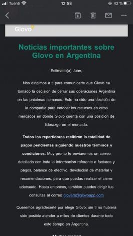 "Estimado (a), nos dirigimos a ti para comunicarte que Glovo ha tomado la decisión de cerrar sus operaciones Argentina en las próximas semanas. Esto ha sido una decisión de la compañía para enfocar los recursos en otros mercados en donde Glovo cuenta con una posición de liderazgo en el mercado. Todos los repartidores recibirán la totalidad de pagos pendientes siguiendo nuestros términos y condiciones. Muy pronto te enviaremos un correo detallado con toda la información referente a facturas y pagos, balance de efectivo, devolución de material y recomendaciones, para que puedas realizar el cierre adecuado", lanzó un comunicado la compañía Glovo a cada uno de sus repartidores.