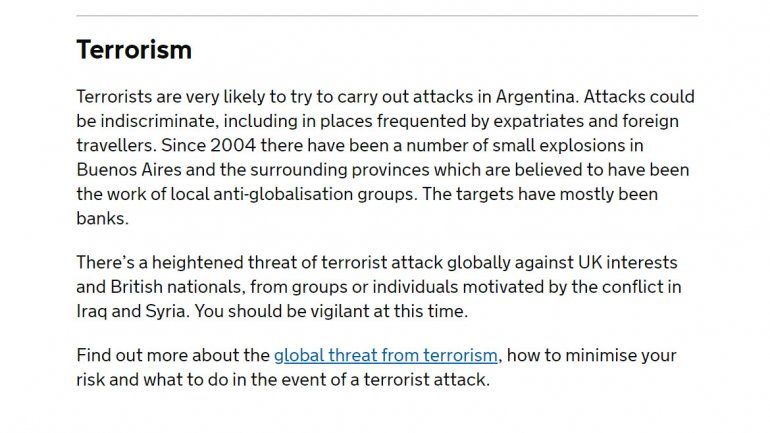 "Los ataques podrían ser indiscriminados, incluyendo lugares frecuentados por expatriados y viajeros extranjeros", señaló el Foreign Office a través de sus habituales consejos para ciudadanos británicos que viajen a la Argentina.