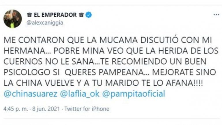 "Me contaron que la mucama discutió con mi hermana", comenzó diciendo Alex Caniggia en su cuenta de Twitter, recordando el sobrenombre que algunas modelos le adjudicaron a Pampita en sus inicios en el mundo de la moda.