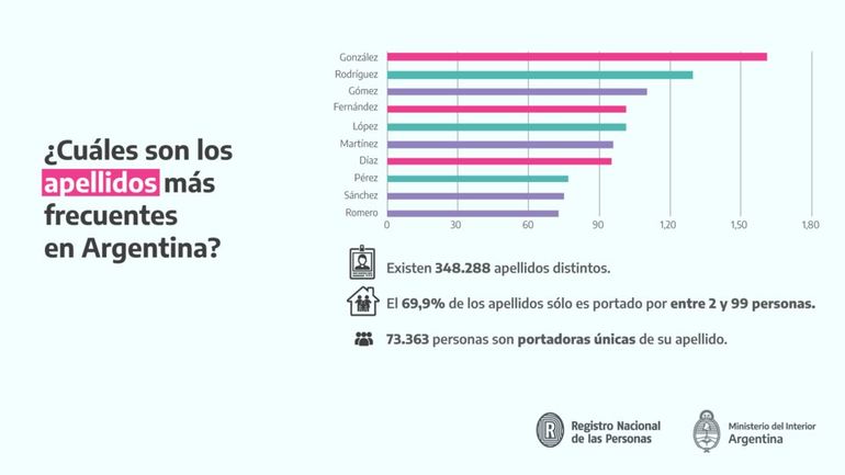 Según el organismo dependiente del Registro Nacional de las Personas (Renaper), en Argentina hay 348.288 apellidos distintos. Entre los 10 más frecuentes están los ya mencionados con el puesto número uno y número dos respectivamente, y Gómez completa el podio. Le siguen Fernández, López, Martínez, Díaz, Pérez, Sánchez y Romero. Todos ellos representan al 10,4% de la población nacional.