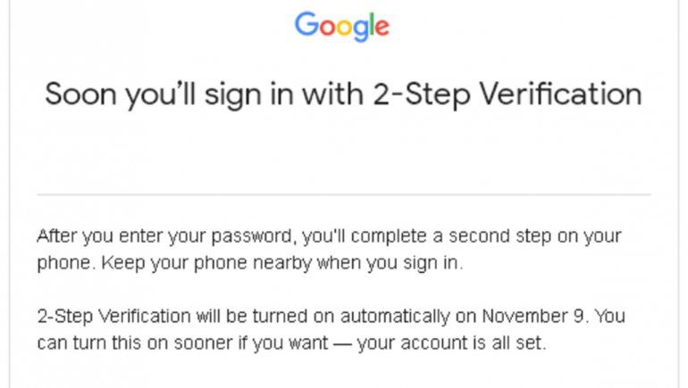 Algunos usuarios puede que ya hayan recibido este tipo de mensajes vía mail para advertir de este cambio forzoso. ""Después de introducir la contraseña, tendrás que completar un segundo paso en el dispositivo. Debes tener tu teléfono cerca cuando vayas a iniciar sesión. La verificación de dos pasos será activada automáticamente el 9 de noviembre. Si no quieres esperar, ya puedes activar esta característica."