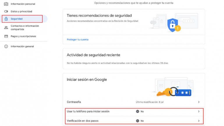 Para aquellos usuarios que quieran activar la verificación de dos pasos solo tienen que acceder a su cuenta de Google, ir a Seguridad pulsar en "Activar la verificación en dos pasos" y seguir las instrucciones que se muestran en pantalla.
