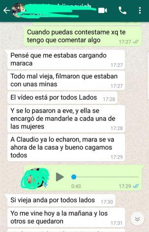 “Anoche le envié el video a todos los chicos que tengo de contacto. A todos los que tenía de contacto se los envié para que ellos sepan que yo ya sabía, que sé todo lo que estaban haciendo. Y los muy boludos, lo primero que hicieron -Mati principalmente- fue decirme que no hiciera nada, que no viralizara el video. Para que sepan que yo ya sabía lo que estaban haciendo”, relató una de las esposas en un audio de WhatsApp.