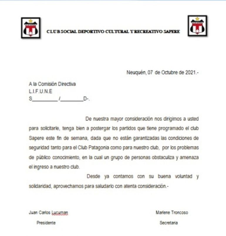 Debido a estos inconvenientes el club pidió postergar el partido que tenían programado hoy con Patagonia por el torneo local.