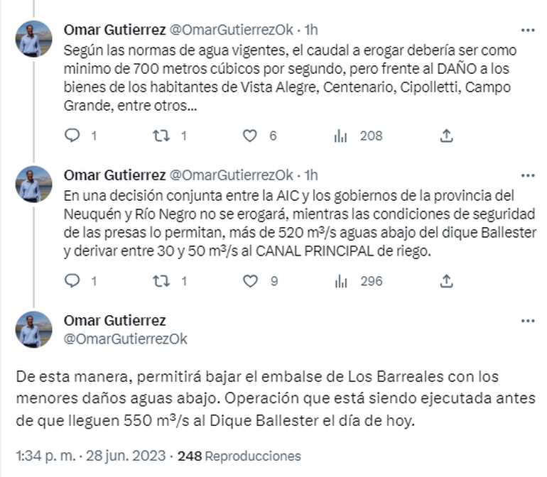 "De esta manera, permitirá bajar el embalse de Los Barreales con los menores daños aguas abajo. Operación que está siendo ejecutada antes de que lleguen 550 m³/s al Dique Ballester", remató el mandatario.