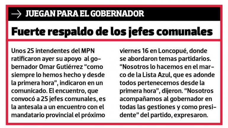 “Lamentablemente, no voy a poder concurrir el viernes que viene porque tengo una agenda de trabajo en Loncopué”, contestó ayer Gutiérrez, poco antes de que 25 intendentes salieran a expresar su apoyo al gobernador a través de un comunicado.